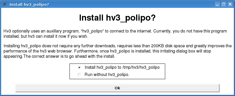 Бразуер шустренько (доли секунды, что и не странно — там той hv3_polipo всего 160 кб) поставил чего хотел и запустился. Вот так выглядит главное окно программы: