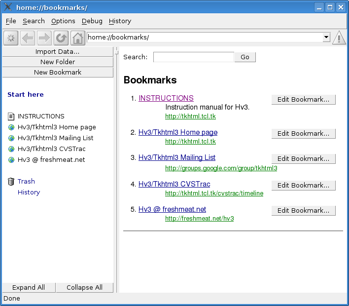 Первым делом я посетил домашнюю страничку самого Hv3 — просто чтобы проверить способность этого браузера хоть что-то отображать. Оказалось, что со связкой HTML+CSS программа справляется достаточно хорошо. Сразу же воспользовался опцией самого Hv3 — в контекстном меню области отображения выбрал Debug, а далее Exec firefox -remote, после чего та же страничка открылась и в Iceweasel. Найти отличий мне так и не удалось.