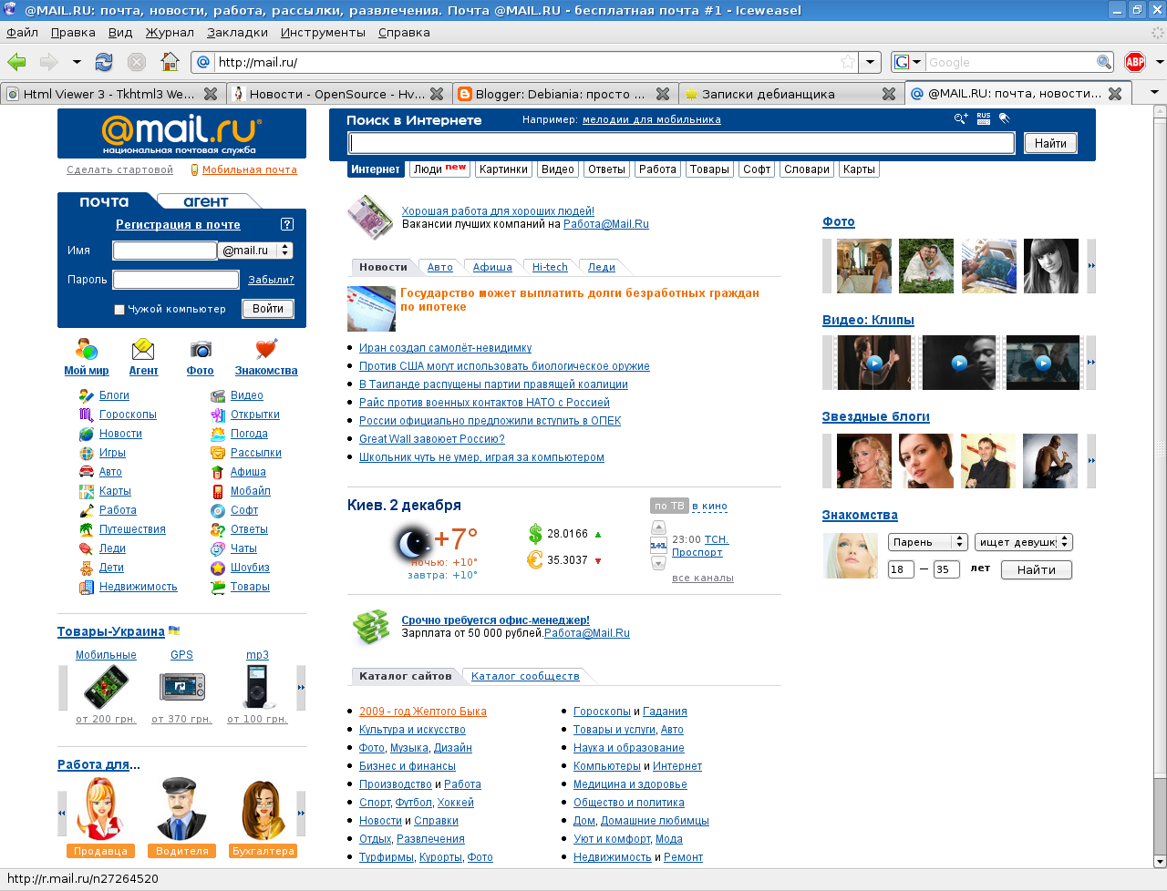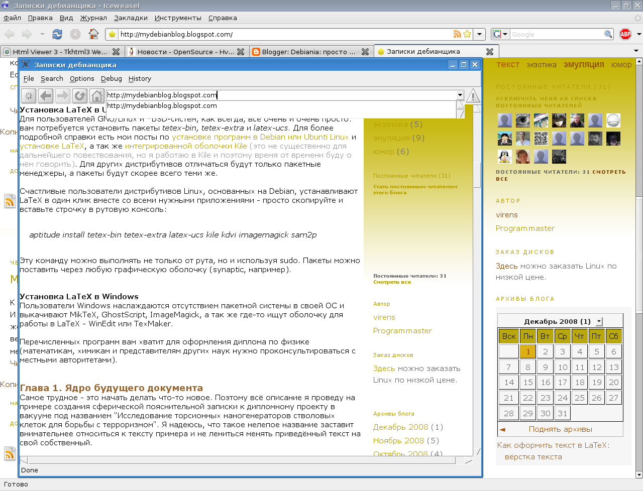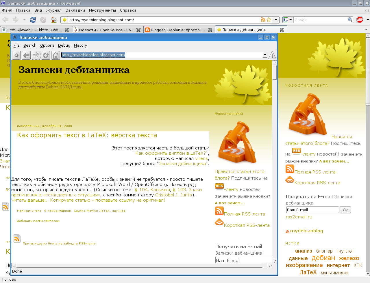 Ну что же, настал черед более серьёзных сайтов. В адресную строку было вбито первое, что взбрело в голову — а именно адрес блога virens’а, mydebianblog.blogspot.com. Как и все нормальные браузеры, Hv3 добавил префикс протокола — http:// — и принялся грузить страничку, активно информируя меня о происходящем посредством строки состояния. Загрузка отняла у секунд 20 — кстати, Iceweasel тратит на это примерно столько же. Скроллнув страничку чуть ниже, я понял, что зря так хвалил новый браузер — он не смог отобразить ни маленьких аватарок пользователей, являющихся постоянными читателями “Записок дебианщика”, ни календаря постов. На скрине вы можете увидеть Hv3 и Iceweasel и почувствовать разницу в отображении. Тем не менее, фирменный оранжевый микроскоп virens’а таки отобразился — а значит, браузер всё-таки не безнадёжен (демонстрация на втором скрине).