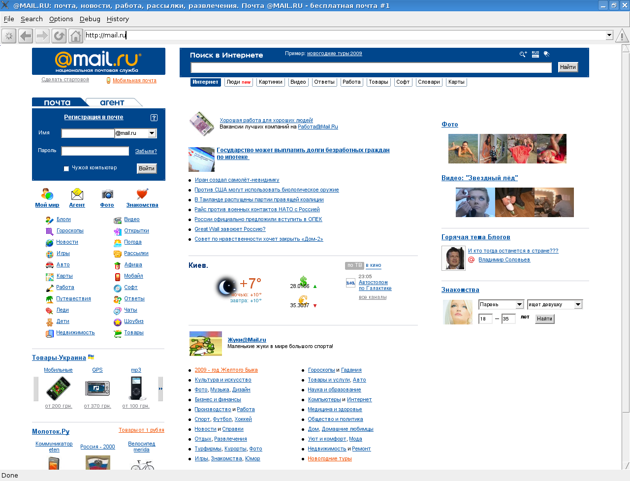 “Куда бы ещё ткнуться?” — спросил внутренний голос, в то время как пальцы уже набивали на клавиатуре адрес сайта, выглядящего достаточно удобным тестом на отображение (картинок довольно много, плюс ещё есть немного рюшечек) — mail.ru. К моему удивлению (а в некоторой степени и удовлетворению), страницы выглядели почти одинаковыми, что вы и можете лицезреть на скриншотах чуть ниже.