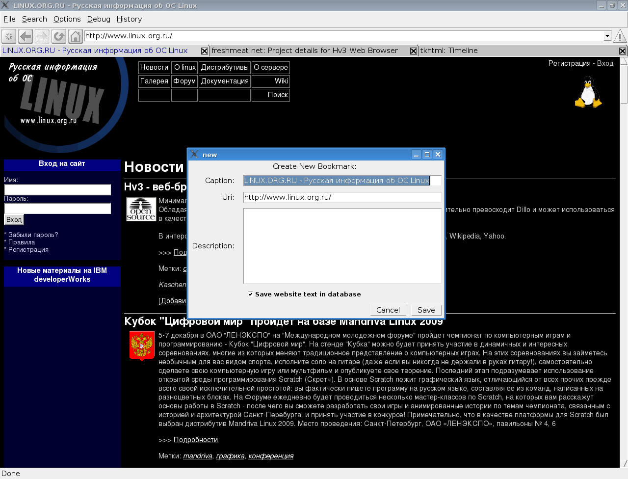 Недавно на www.linux.org.ru появился коротенький анонс новенького браузера — Hv3. Меня, конечно же, захлестнуло любопытство, и я его скачал. О моих впечатлениях от 20-тиминутного тестинга читайте ниже.