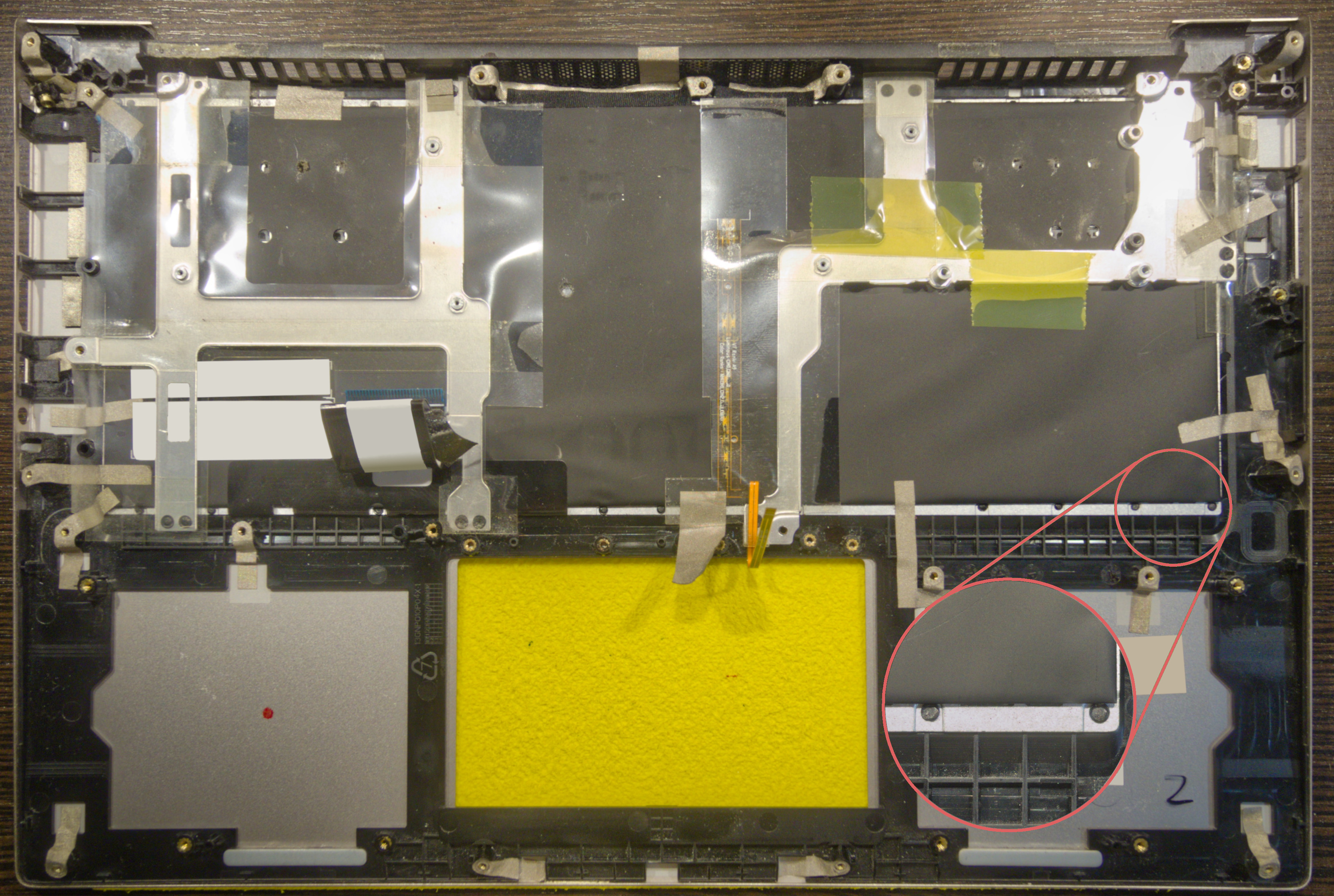 (The big yellow rectangle is a mat visible through the hole left by the touchpad.)